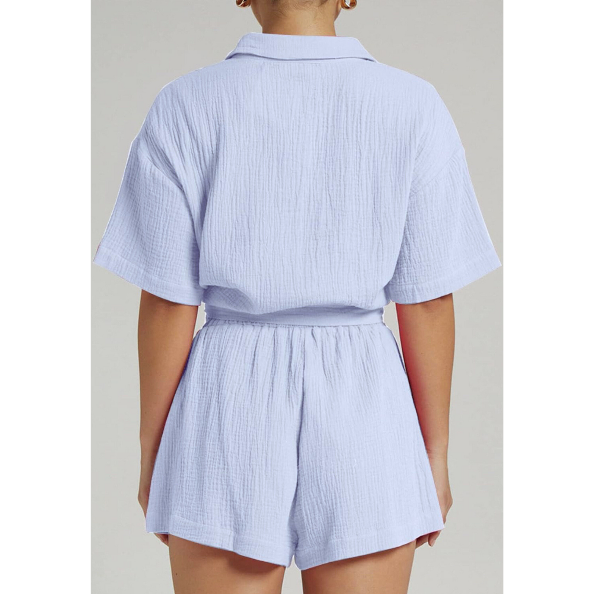 - Short-sleeve button-down front top with a classic collar for a sophisticated touch.